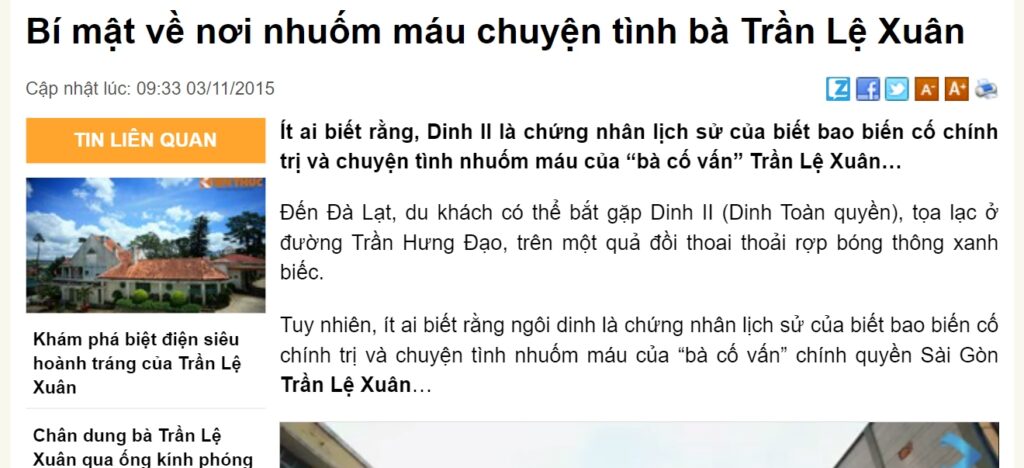 Trong bài viết đề tựa “Bí mật về nơi nhuốm máu chuyện tình bà Trần Lệ Xuân”, tác giả viết: