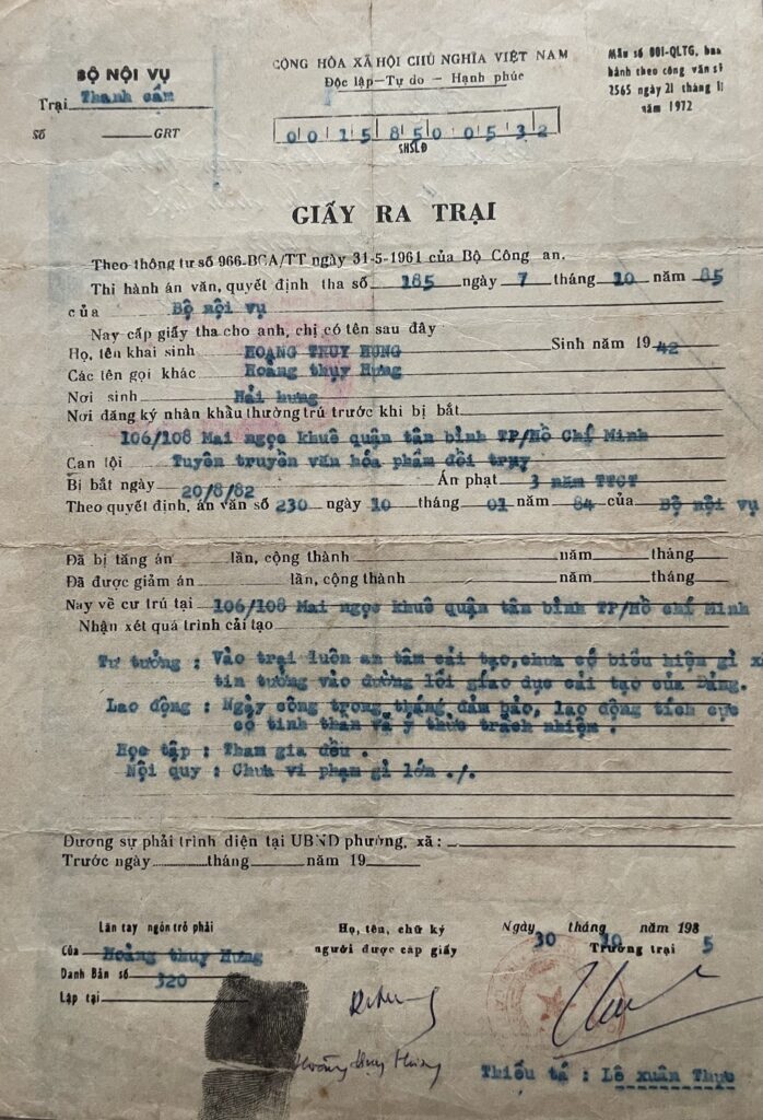 “… Thi hành án văn, quyết định tha số 185 ngày 7 tháng 10 năm 85… Nay cấp giấy tha cho anh, chị có tên sau đây: Hoàng Thuỵ Hưng sinh năm 1942… Can tội: Tuyên truyền văn hoá phẩm đồi truỵ [!] Bị bắt ngày 20/8/82 [ngày bị bắt chính xác là 17/8/1982] Án phạt: 3 năm TTCT Theo quyết định, án văn số 230 ngày 30 tháng 1 năm 84 của Bộ nội vụ…”