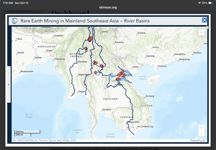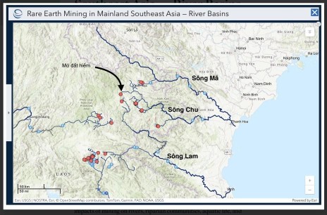 Trung tâm Stimson đã lập một bản đồ tương tác định vị các mỏ đất hiếm ở Đông Nam Á, nhiều trong số đó do các công ty Trung Quốc vận hành. Tại Lào, ít nhất 12 mỏ nằm gần thượng nguồn các sông Mã, sông Chu và sông Lam. Các hoạt động này đe dọa trực tiếp đến Việt Nam, vì các con sông chảy từ Lào vào các tỉnh đông dân của Việt Nam. Việc khai thác đất hiếm, cần thiết cho các công nghệ như xe điện và tua-bin gió, tạo ra lượng chất thải khổng lồ—khoảng 2.000 tấn chất thải cho mỗi tấn đất hiếm khai thác được. Chất thải này thường chứa asen, thủy ngân, cadmium và các kim loại nặng khác, rất khó và tốn kém để xử lý khi đã phát tán ra môi trường.